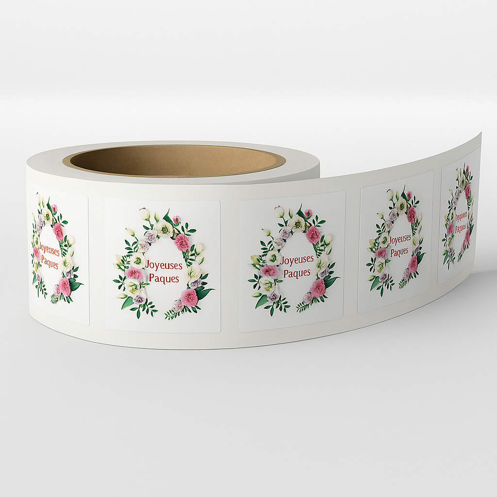 Etiquettes format 3 x 3 cm disponibles de 250 à 10 000 exemplaires livrées en rouleau.